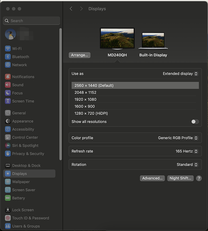 ①Artist Pro 24(Gen2)165Hz を Mac に接続し、Mac の画面上部にある Appleロゴをクリックし、「システム設定」をクリックします。