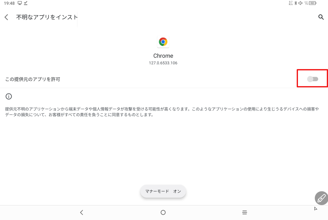 4)セキュリティの警告が出たら「設定」をクリックし、この提供元のアプリを許可してください。