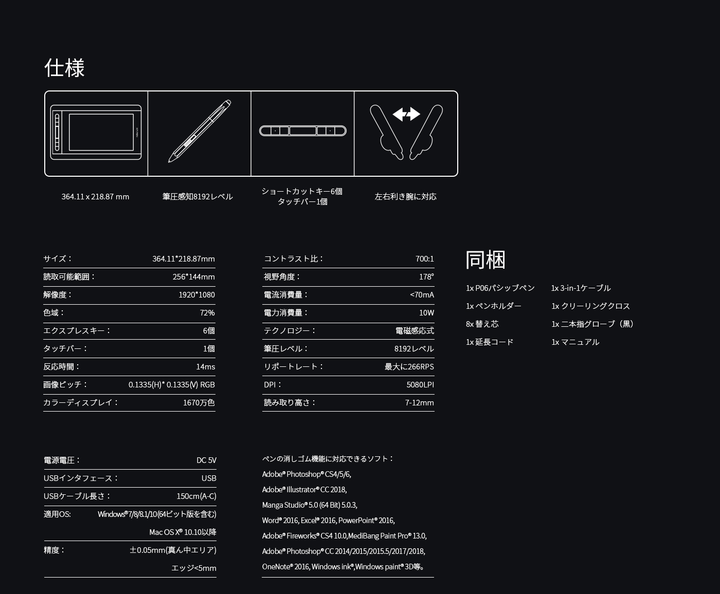 対応ソフトウェア: Photoshop®、SAI®、Painter®、Illustrator®、Clip Studio®、Open Canvas®などの主要ソフトに対応します。