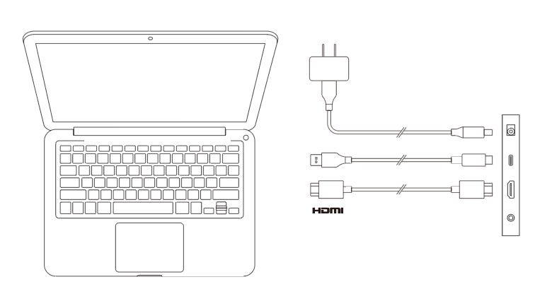 次の図に示すように、HDMIケーブルをコンピュータのHDMIポートと液晶ペンタブレットに接続し、ビデオ信号を送信します。また、USB-C to USB-AケーブルまたはUSB-C to USB-CケーブルのいずれかをコンピュータのUSBポートと液晶ペンタブレットに接続して、データ信号を送信します。