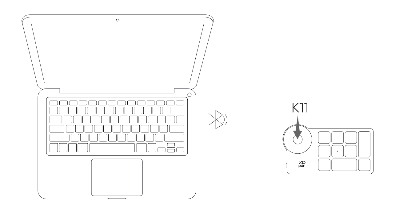 1)ワイヤレスショートカットリモートの電源スイッチをオンにすると、インジケータランプがゆっくりとブルーに点滅します。K11キーを6秒間押し続けてペアリングモードに入ると、インジケータランプがすばやくブルーに点滅します。