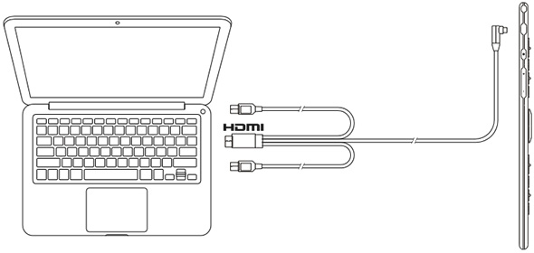 b. HDMIケーブルと黒色および赤色のUSBケーブルをパソコンに接続します。(液晶ペンタブレットの電源が入らない場合は、HDMIケーブルと黒色のUSBケーブルをパソコンに接続した後、赤色のUSBケーブルを延長ケーブルとUSBアダプターに接続し、電源コンセントに差し込んで給電してください。)
