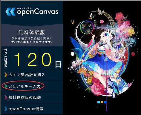 ⑨インストールが完了したらopenCanvasを起動してください。無料体験版として起動されるため、製品版としてライセンス認証を行います。無料体験版の「シリアルキー入力」をクリックして、④で取得した「シリアルキー」を再度入力してください。