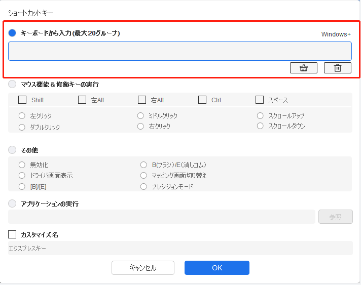 ドロップダウンメニューで「カスタマイズ」を選択すると各キーの機能をカスタマイズでき、「カスタマイズ」で「マウスでコントロール」または「キーボードから入力」を選択すると、複数キーの組み合わせなどを割り当てられます。
