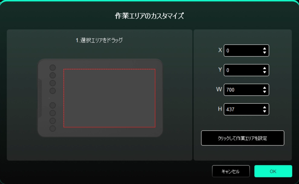 クリックして作業エリアを設定: デバイス上でスタイラスペンを使って左上の位置と右下の位置をクリックして選択します。
