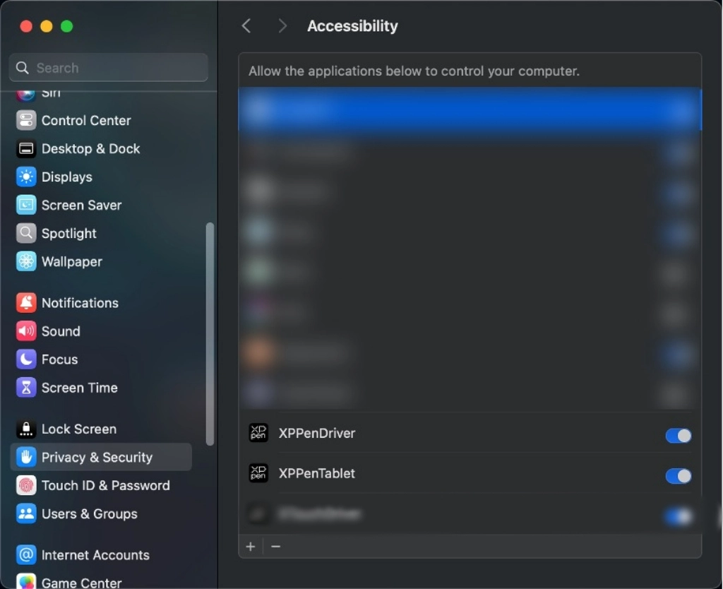 解凍後、「pkg」ファイルを実行し、案内に従ってインストールを完了して、必要なセキュリティ設定(システム環境設定→プライバシーとセキュリティ→アクセシビリティ)を設定します。アクセスを許可後、XPPenDriverおよびXPPenTabletのオプション「有効」にチェックを入れるかを確認してください。チェックを入れていない場合、デバイスとドライバーが正常に動作しない可能性があります。